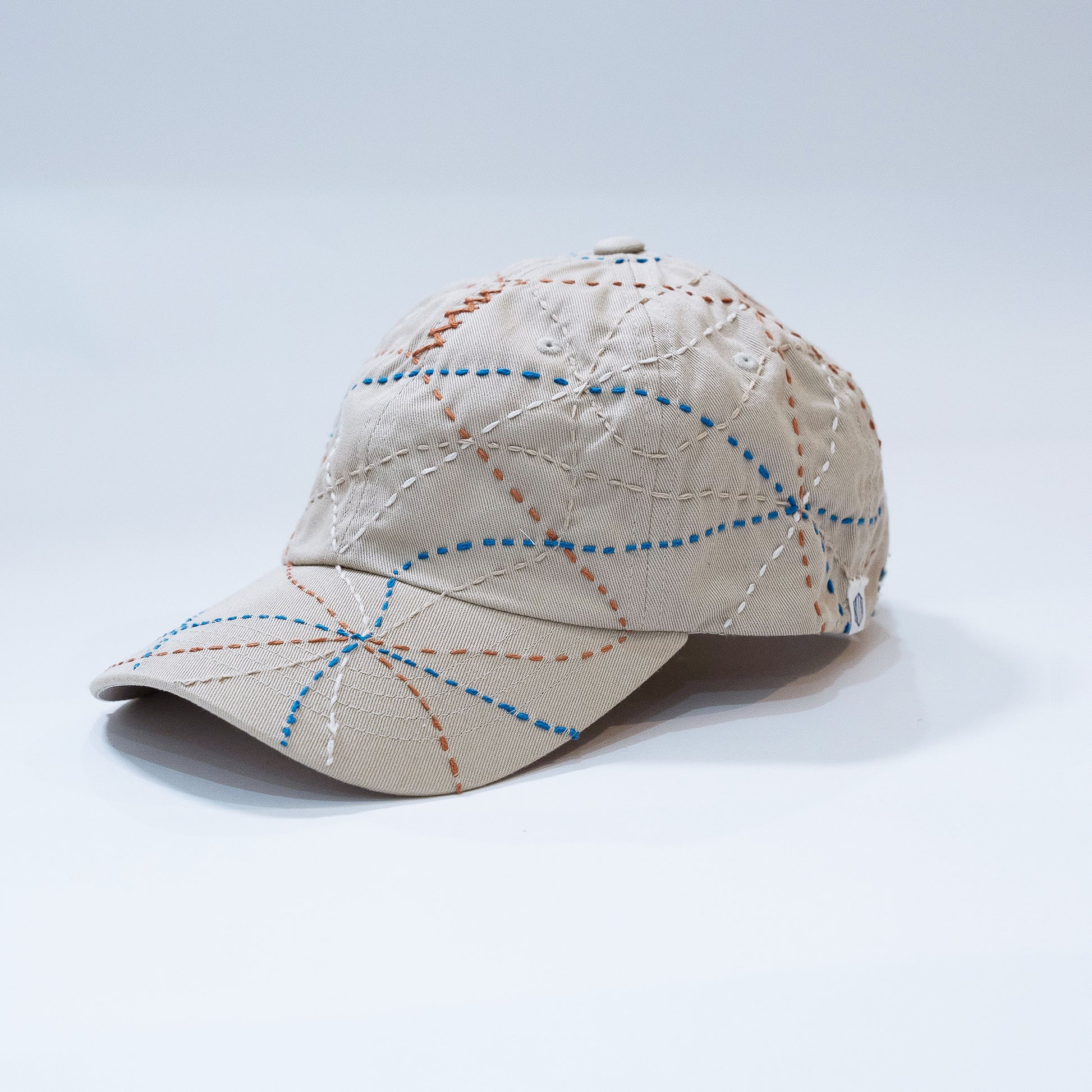 サシコギャルズによる手刺し子が施されたダッドキャップ。伝統柄とは異なるオリジナルの柄は唯一無二の存在感を放つ仕上がり。日々のシンプルなコーディネートのアクセントとして大活躍。