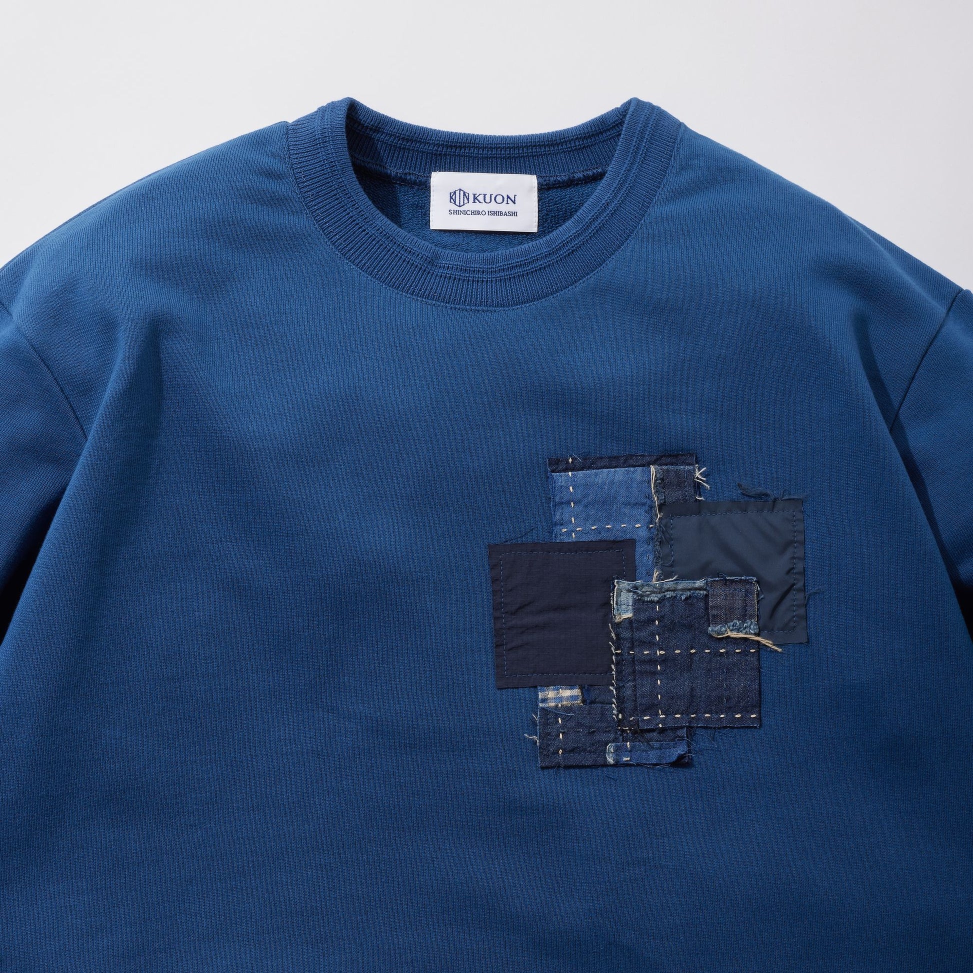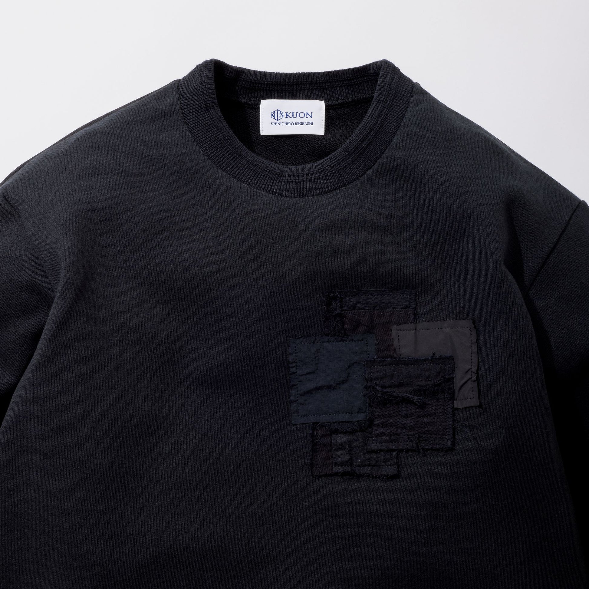 Upcycled Boro Type02 and other remnant fabrics patched sweatshirt with originally knit ribs.