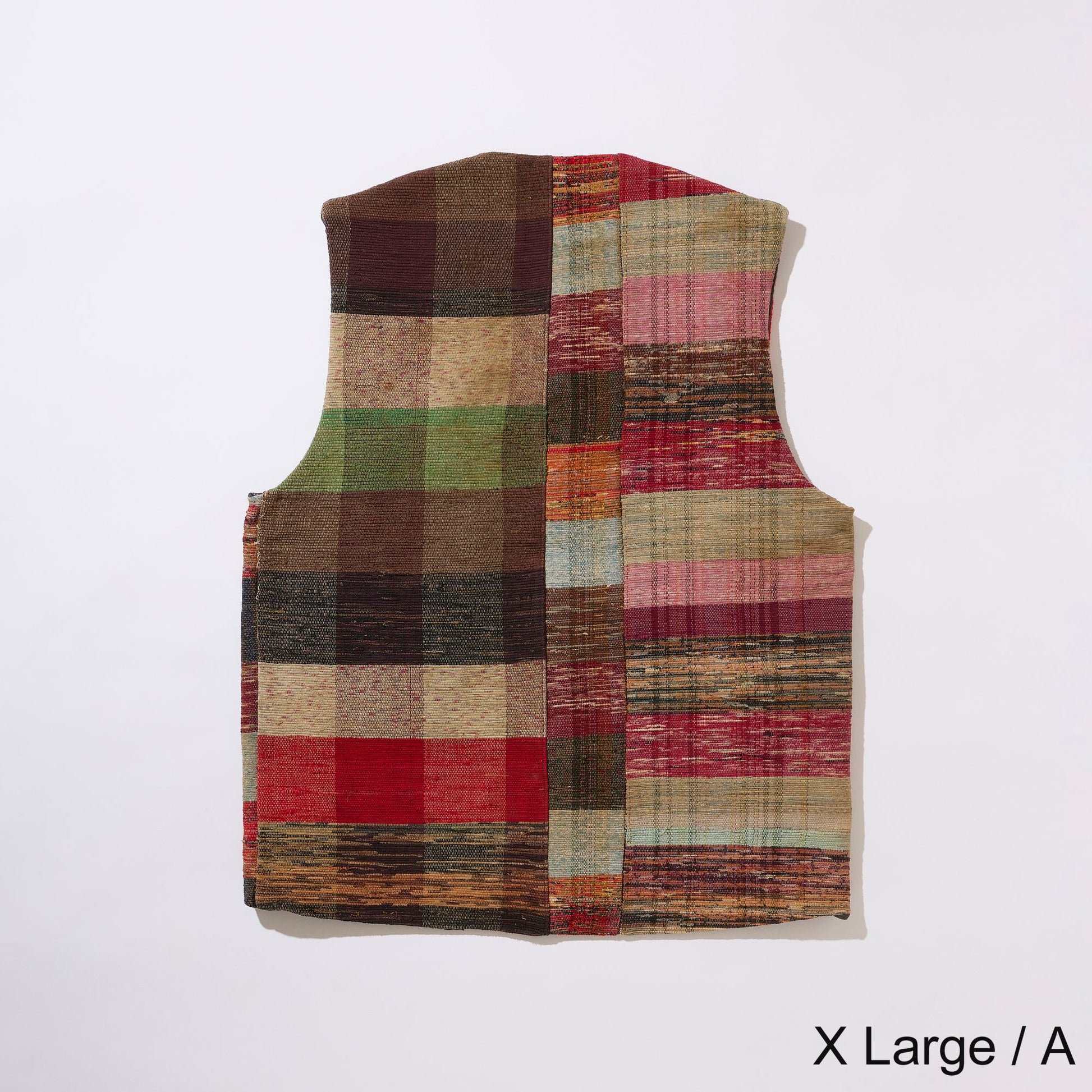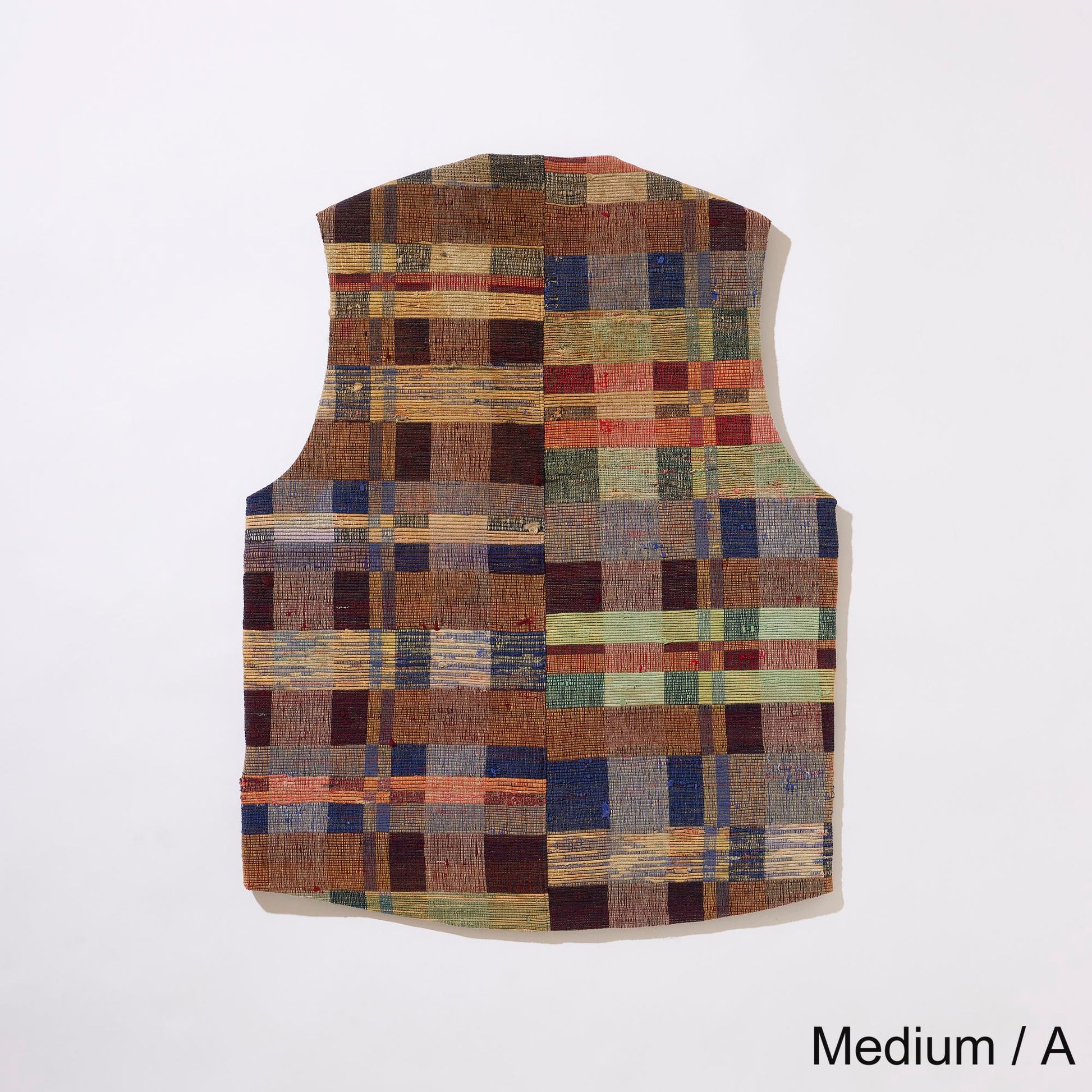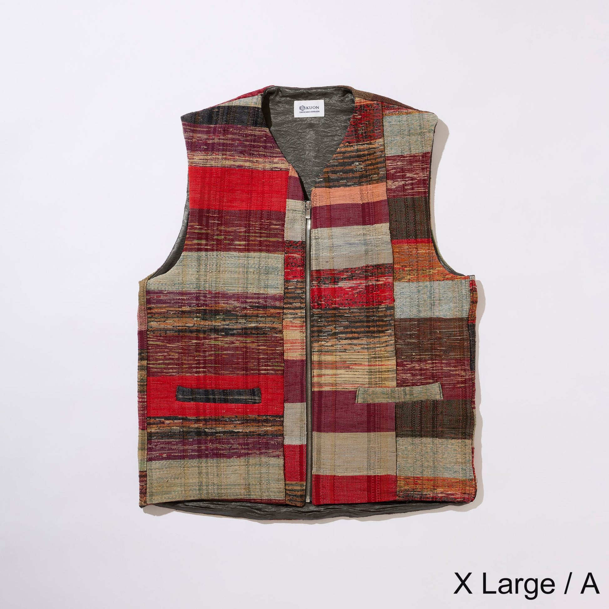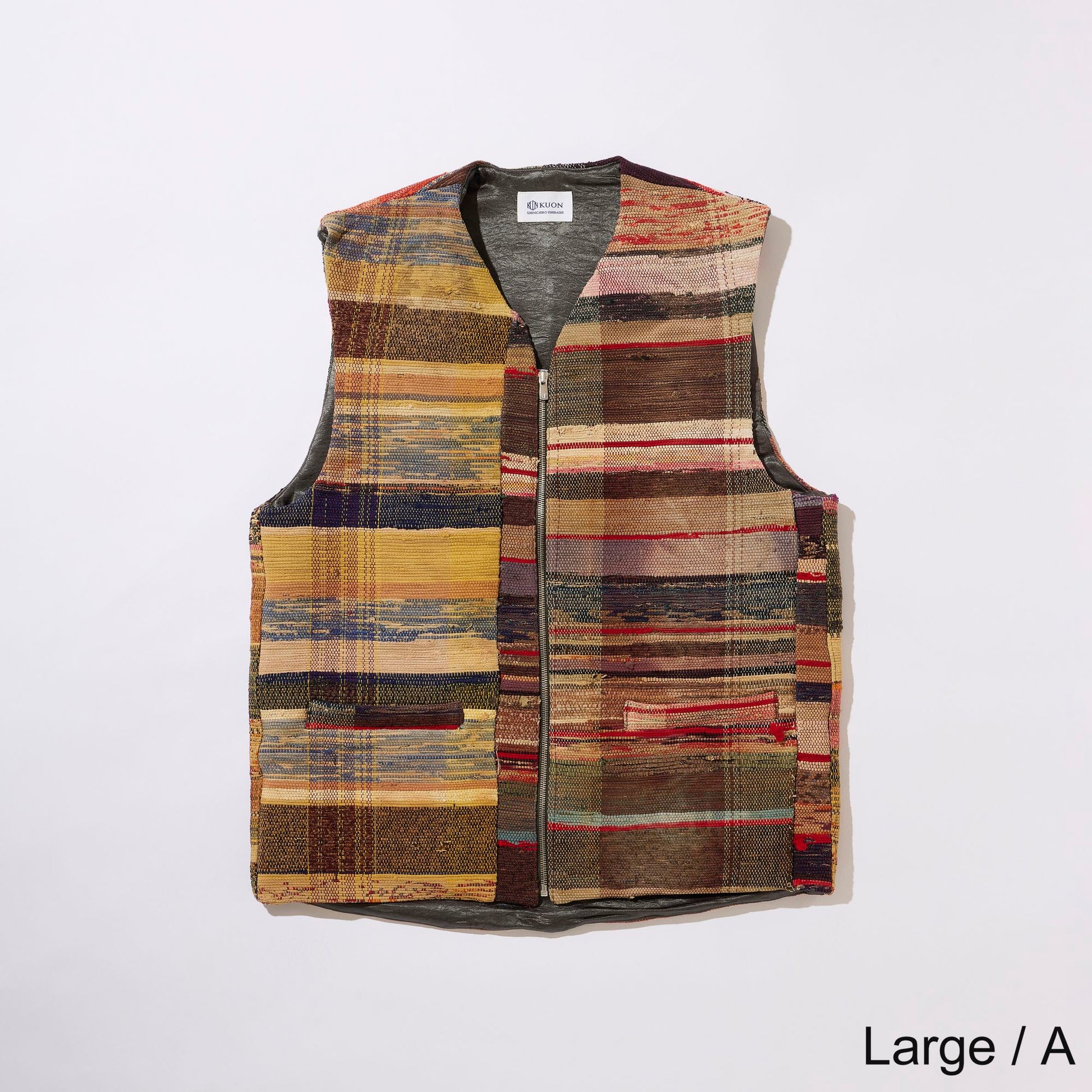 V-neck vest in vintage Sakiori fabric. To match the texture of Sakiori, the lining is made of vintage touch acetate fabric.