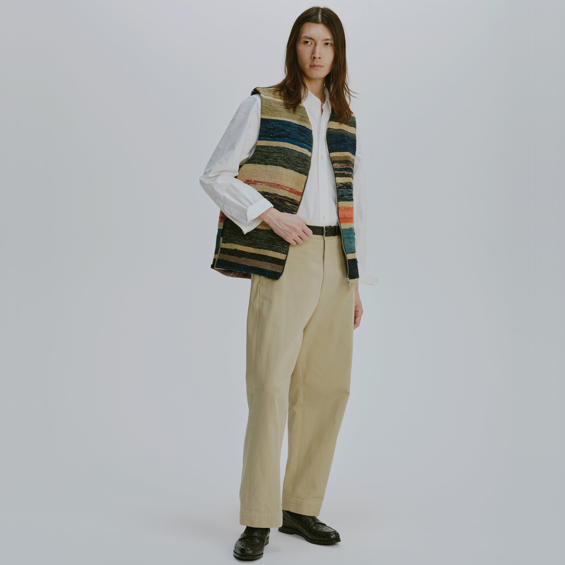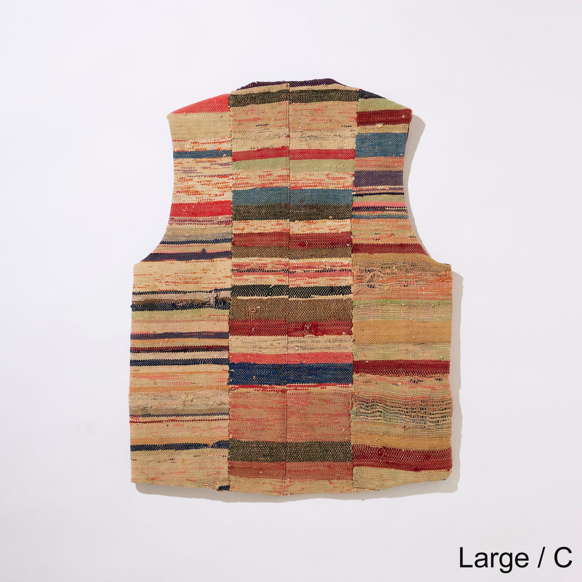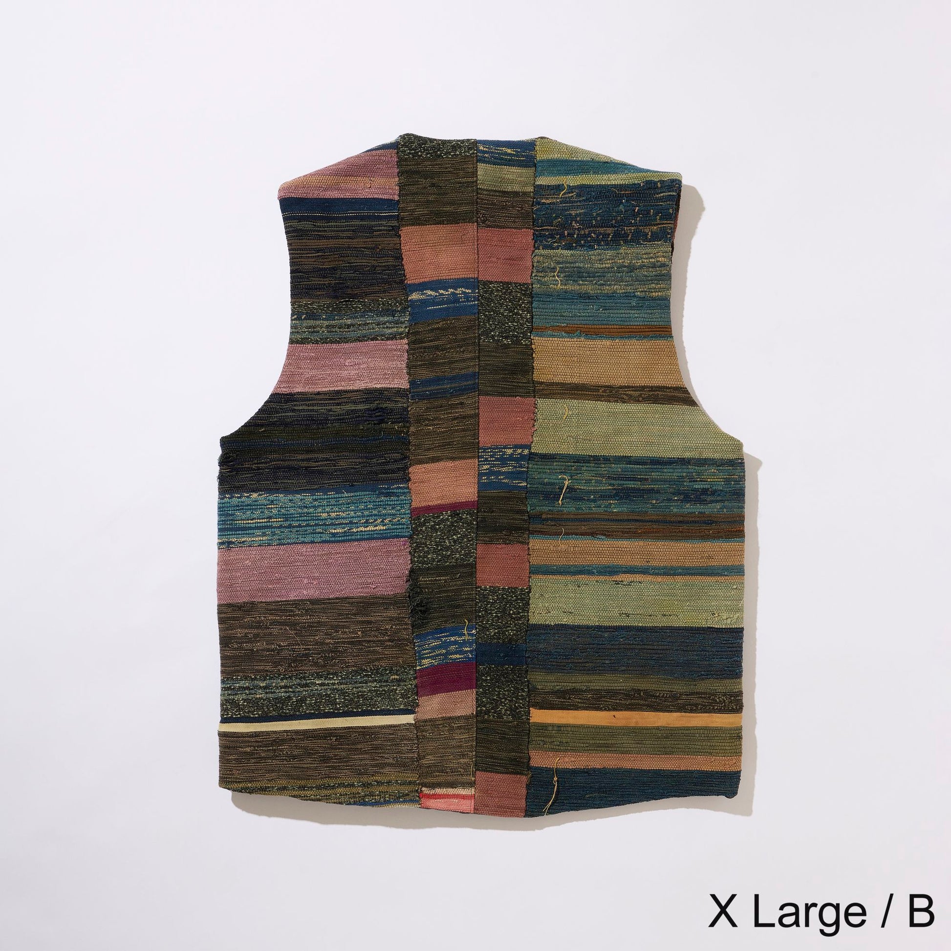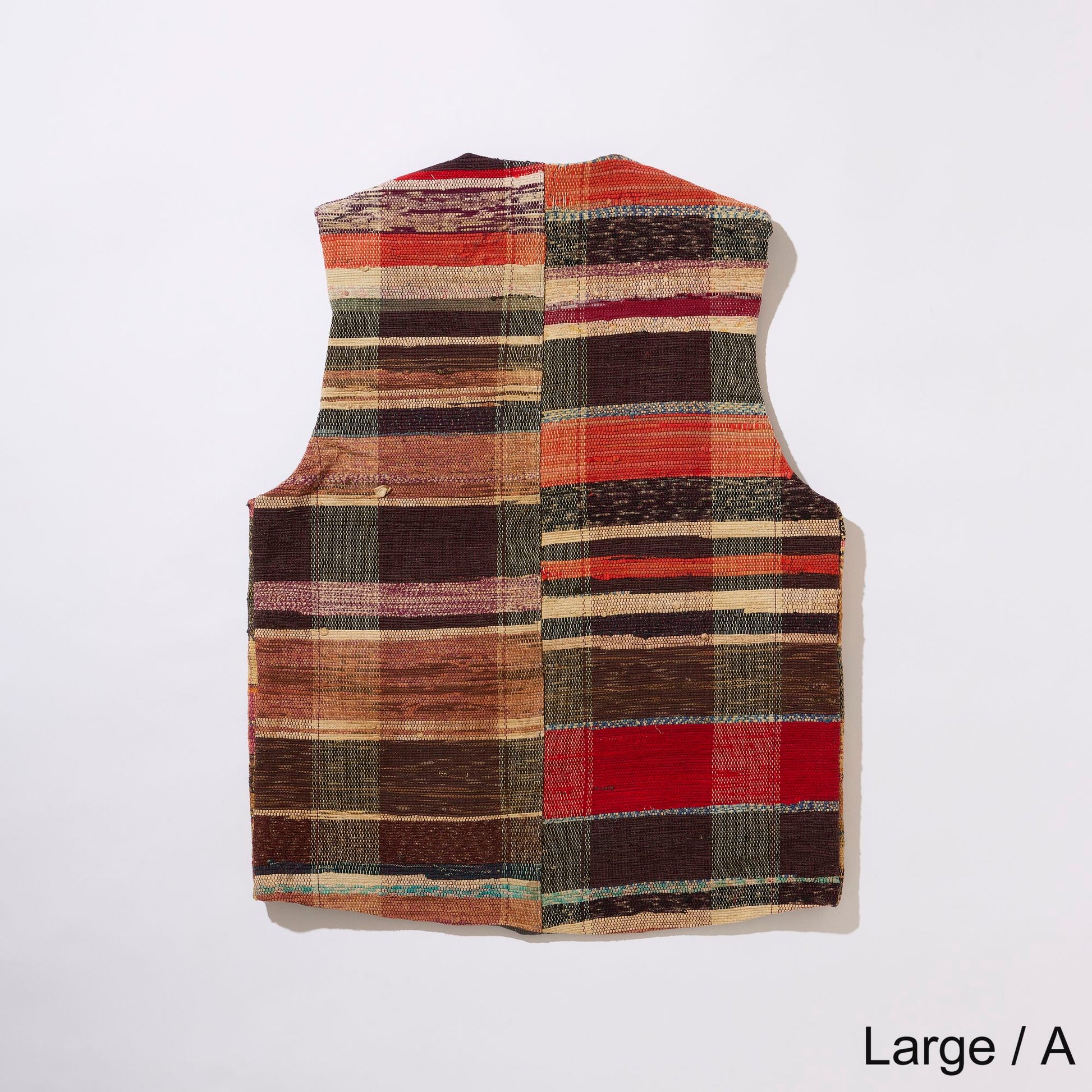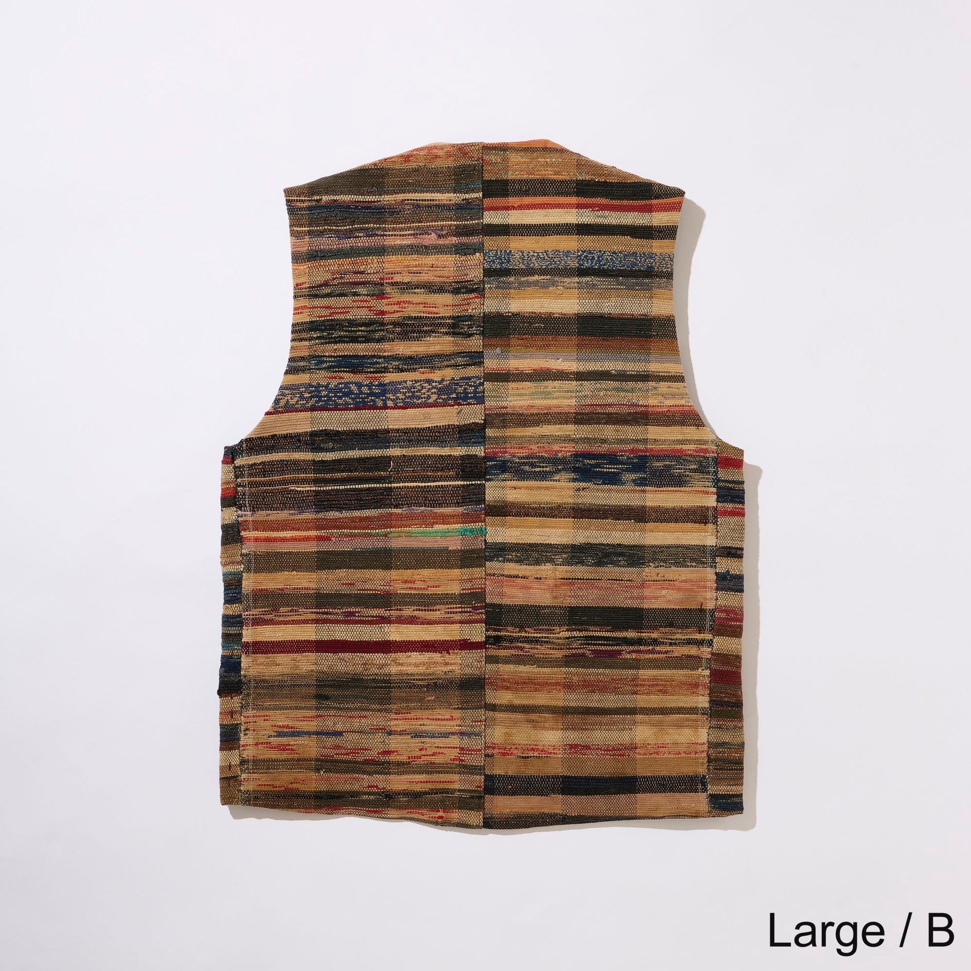 V-neck vest in vintage Sakiori fabric. To match the texture of Sakiori, the lining is made of vintage touch acetate fabric.